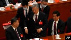 CNAགསར་ཁང་གིས་སྤེལ་བའི་ཚོགས་ཆེན་ཉི་ཤུ་པའི་སྐོར་གྱི་བརྙན་པར་གསར་ཤོས་ལ་གཞིགས་ན། ཧུའུ་ཅིང་ཐའོ་ཚོགས་ཁང་ནས་ཕྱི་ལོགས་སུ་བཙན་ཁྲིད་བྱེད་དོན་གཙོ་བོ་ནི། ཁོའི་མདུན་གྱི་ཡིག་ཆ་དེ་དང་ཁར་ཐུག་འབྲེལ་བ་ཡོད་པ་ཞིག་སྟེ། ཧུའུ་ཅིང་ཐའོ་ཡིས་ཡིག་ཆ་དེ་ཐེངས་འགའ་བལྟ་ཐབས་བྱས་ཡོད་ཀྱང་། འཁྲིས་ལ་སྡོད་མཁན་ལི་ཀྲན་ཧྲུའུ་དང་། ཞི་ཅིང་ཕིང་གཉིས་ཀྱིས་བཀག་ཐབས་བྱས་ཏེ། ཁོ་ཚོའི་དབར་ཡིག་ཆ་དེའི་སྐོར་ནས་ཀ་ཀོར་ཐེངས་འགའ་བྱས་རྗེས། ཞི་ཅིང་ཕིང་གིས་བདེ་སྲུང་མི་སྣ་འདྲ་པོ་ཞིག་སྐད་བཏང་ནས་ལྐོག་ཏུ་སྐད་ཆ་འགའ་ཤས་བཤད་རྗེས། བདེ་སྲུང་མི་སྣ་དེ་ཧུའུ་ཅིང་ཐའོ་ཡི་འཁྲིས་ལ་ཆས་ནས་ཧུའུ་ཅིང་ཐའོ་ཡི་མཆན་འོག་ནས་ཡར་བཀྱག་ཐབས་བྱས་ཀྱང་། ཧུའུ་ཅིང་ཐའོ་ཡར་ལངས་མེད་པར་མཐར་མི་གཉིས་ཀྱིས་ཧུའུ་ཅིང་ཐའོ་ཚོགས་ཁང་ནས་ཕྱི་ལོགས་སུ་བཙན་ཁྲིད་བྱས་ཡོད་པ་རེད།