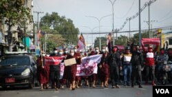 ༄༅།། འབར་མའི་དམག་གིས་གྱེན་ལངས་བྱུང་སྟེ་དམངས་གཙོའི་ལམ་ནས་འོས་འདེམས་བྱས་པའི་དབུ་ཁྲིད་ཨཱང་སང་སུ་ཆི་འཛིན་བཟུང་བཀག་ཉར་བྱས་པའི་རྗེས་སུ་རྒྱལ་ས་དང་གྲོང་ཁྱེར་ཆེ་ཁག་ཏུ་དགེ་འདུན་པ་དང་སྨན་ཞབས་པ་སོགས་མི་མང་ཁྲི་ཚོ་ཁ་ཤས་ཀྱིས་ལག་པ་གཡས་པའི་མཛུབ་མོ་གསུམ་གནམ་ལ་ཀེར་ནས་དྲག་པོའི་སྲིད་གཞུང་ལ་ངོ་རྒོལ་དང་ལྕམ་སུ་ཆི་གློད་གྲོལ་གཏོང་དགོས་ཞེས་ཞི་བའི་སྐད་འབོད་ཀྱི་ལས་འགུལ་ཁག་གཟའ་ཟླ་བའི་བར་དུ་ཉིན་གསུམ་ལ་རྒྱུན་འཁྱོངས་བྱས་ཡོད་པའི་སྐོར། པ་སངས་དབྱངས་སྐྱིད་ཀྱིས་སྙན་སྒྲོན་ཞུ་ཡི་རེད།།