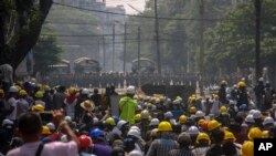 ༄༅།། ལྷོ་ཤར་ཨེ་ཤི་ཡའི་ཡུལ་གྲུའི་མཉམ་འབྲེལ་མཐུན་ཚོགས་ཀྱི་ཕྱི་སྲིད་བློན་ཆེན་ཚོས་གཟའ་མིག་དམར་ཉིན་འབར་མའི་དམག་གི་སྐུ་ཚབ་ལ་དྲྭ་ལམ་དུ་ཐུག་འཕྲད་གནང་སྟེ་ལྕམ་ཨང་སང་སུ་ཆིར་གྲོས་མོལ་བྱས་ནས་རྒྱལ་ནང་གི་རྩོད་གཞི་རྣམས་སེལ་ཐབས་བྱ་དགོས་པའི་སྐུལ་ལྕག་བཏང་ཡོད་ཅིང་། ཉེ་ཆར་གཟའ་ཉི་མའི་ཉིན་འབར་མའི་ངོ་རྒོལ་བ་ཚོར་དམག་གིས་མེ་མདའ་བརྒྱབ་ནས་མི་༡༨་བསད་པར་མ་ཟད། དེ་རིང་གཟའ་མིག་དམར་ཉིན་འབར་མའི་ཉེན་རྟོག་པས་སླར་ཡང་ངོ་རྒོལ་བ་ཚོར་འགྱིག་གི་མདེའུ་འཕངས་ནས་མེ་མདའ་བརྒྱབ་ཡོད་པ་སོགས་གནས་ཚུལ་ཐོན་པ་ཁག་པ་སངས་དབྱངས་སྐྱིད་ཀྱིསས་སྙན་སྒྲོན་ཞུ་ཡི་རེད།།